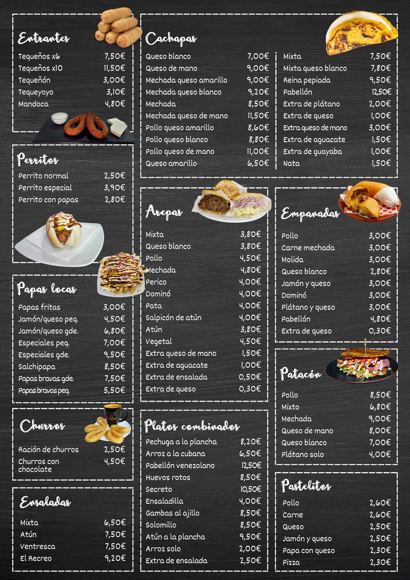Puedes disfrutar de desayunos, cafés, jugos naturales, churros con chocolate, empanadas, arepas, hamburguesas, perritos, papa locas, platos combinados, ensaladas, ¡y mucho más!